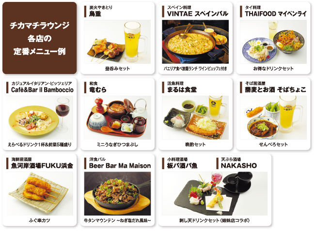 チカマチラウンジは、異国情緒あふれる空間に和食やイタリアン、アジアン、スパニッシュなど11の専門店が軒を連ねる。料理はもちろん、アルコール類も充実しており、店によってビールを20種類以上そろえていたり、ワインの飲み放題コースを用意していたり、希少な日本酒に力を入れていたりと、専門性と工夫が随所にうかがえる。ランチタイムには周辺のビジネスパーソンでにぎわい、夜には仕事帰りの一杯を楽しむ人々が集うなど、時間帯に応じた多様な利用ニーズに応えている。