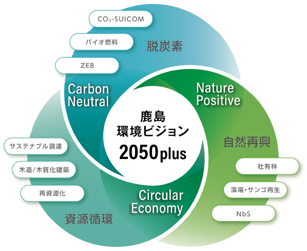 これらの取り組みは、当社だけでの実行が難しいことを私たちは認識しています。顧客、社会と協力して取り組んでいく意思と、2050年の先を見据えた永続性を「plus」に込めて、鹿島は新たな環境ビジョンのもと、経済活動と環境保全が両立する持続可能な社会の実現に向け、取り組みを推進していきます。