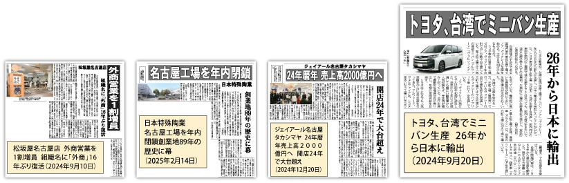 東海地方は自動車や工作機械、電機部品、半導体、航空機部品メーカーなどの本社、工場、研究開発拠点が集積しており、世界に冠たる「ものづくりの中枢圏域」です。グローバル企業も多いことから、当地の企業情報は地域の枠を超え、世界への情報発信につながります。トヨタ自動車や中部電力、JR東海など大手企業に加え、陶磁器や繊維など地場産業の情報発信にも力を入れています。