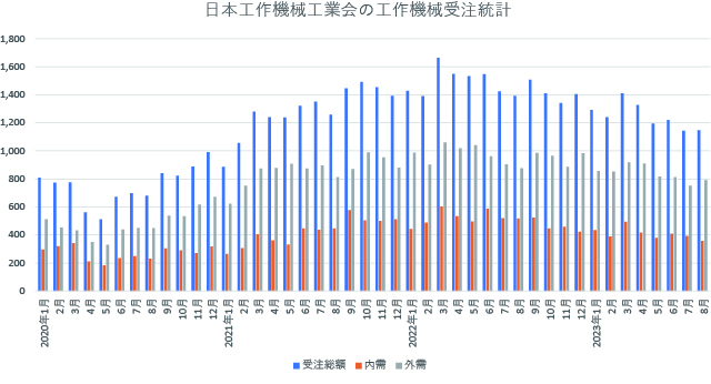 一方、直近の8月の受注実績は、前月比では、0・4%増と2カ月ぶりに増加した。内需は前年同月比31・0%減の357億2千万円で、前月比でも9・3%減少と厳しさが続いているものの、外需は、前年同月比9・7%減の790億4千万円、前月比では5・5%増と5カ月ぶりに増加に転じた。調整局面が続く中で、日工会は「今後の持ち直しの時期などについて内外経済動向を注視する」としている。