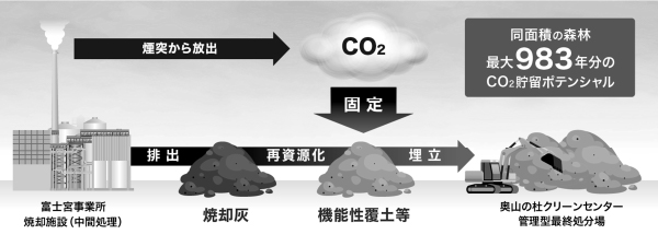 研究の結果、特定のばいじんが重量の最大14%のCO₂を固定できることが明らかになりました。例えば、当社管理型最終処分場・奥山の杜クリーンセンター(埋立容量:約320万㎥)のケースの場合、143,000トンのCO₂を貯蔵できる試算です。