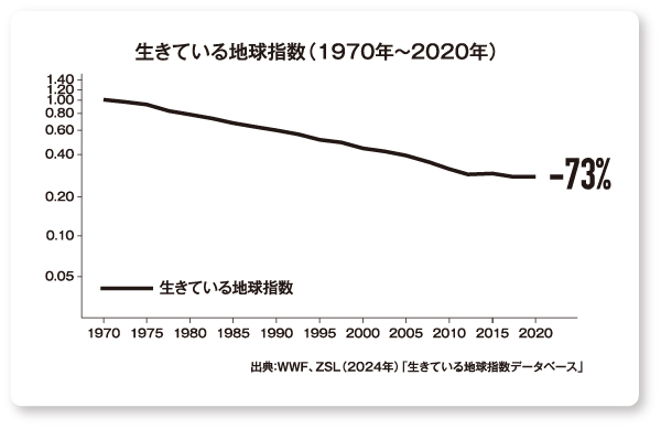 地球上の生物多様性が急速に失われつつある現状を、定量的に示す代表的な指標に「生きている地球指数(Living Planet Index=LPI)」がある。世界自然保護基金(WWF)とロンドン動物学会(ZSL)が共同で発表するこの指数は、世界各地に生息する野生脊椎動物(哺乳類、鳥類、爬虫類、両生類、魚類)約5000種の個体数の変化を追跡し、1970年を基準に減少率を算出している。直近の報告によれば、1970年から2020年までの50年間に、対象となる動物の個体数は平均で73%減少した。