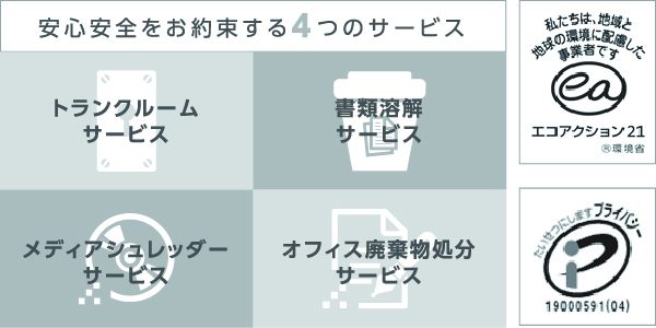 そのほか、書類の保管管理サービスからメディアの破砕処分まで一貫した情報処分サービスを提供しています。プライバシーマークの取得、エコアクション認定、個人情報漏洩賠償責任保険加入などコンプライアンス体制も整っているので、安心してお任せください。