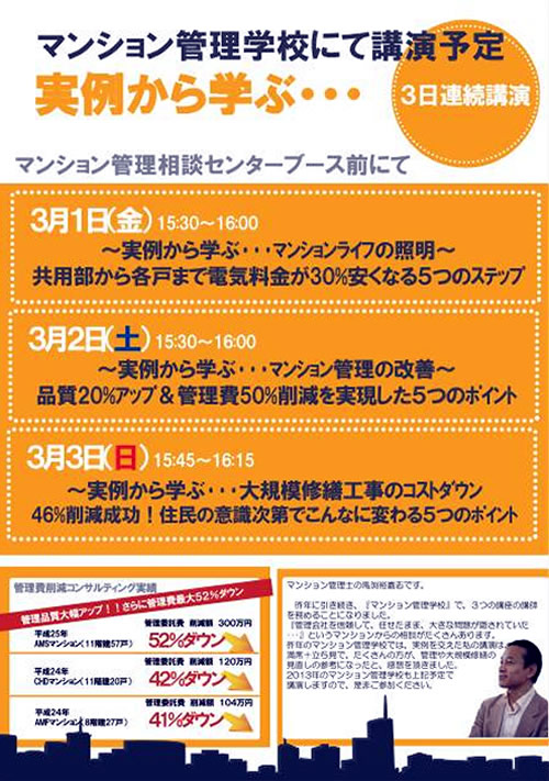 マンション管理フェアの「マンション管理学校」では、昨年に引き続き、毎日1講座を担当し、実例に基づいた「マンション住民が幸せになるポイント」をお話しします。