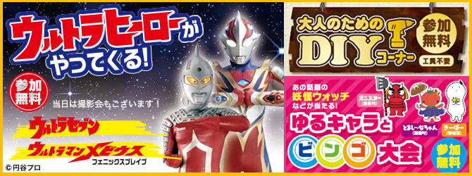 さらに「ゆるキャラビンゴ大会」や「大人のためのDIYコーナー」「働くクルマ」「ダンボール迷路」など家族そろって楽しめるイベントが盛りだくさん!