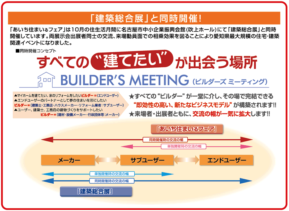 愛知県、名古屋市の行政機関や住まいづくりに関わる公的団体が参加し、住まいの助成制度の紹介や、無料相談コーナーを実施していますので、来場者からの信頼度も高く、入場無料なので住まいづくりに関する総合イベントとして広く認知され多数来場されています。