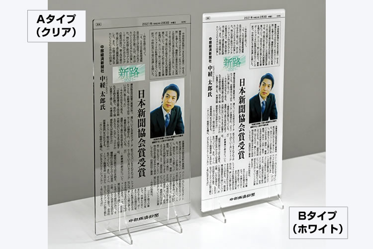 中部経済新聞社では、本紙に掲載された記事を抜き出し、アルミプレートに高精細印刷・加工を行い、スタンドに装着して飾れる「プレート加工サービス」を実施しております。
