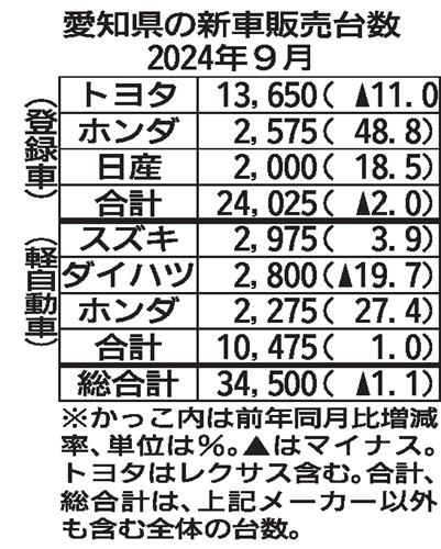 愛知県の2024年9月の新車販売台数(軽自動車含む)は、前年同月比1・1%減の3万4500台だった。前年割れは2カ月連続になる。軽自動車が微増だった一方、登録車が伸び悩んだからだ。特にトヨタ自動車が認証不正問題の影響に加え、前年に車両供給が回復していた反動を受けて2桁減と落ち込んだ。