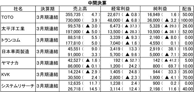 決算詳報 TOTO 太平洋工業 トランコム 日本車両製造 KVK システムリサーチ