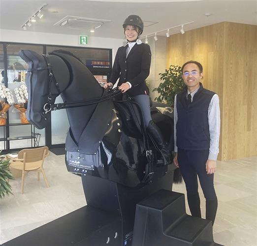 乗馬シミュレーターは実物大の馬にまたがる(右が渡部社長、騎乗しているのはインストラクター)