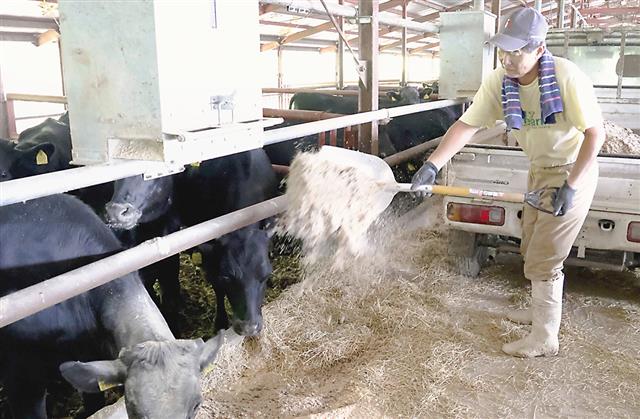 ブドウの搾りかすが混ぜられた餌を牛に与える小林牧場の作業員=8月、山梨県甲斐市