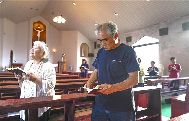 金曜日の夕方、大水教会でイエスの受難をたどる「十字架の道行き」で祈りをささげる大水繁美(手前)ら=長崎県新上五島町(撮影・堀誠)