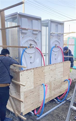能登半島地震で断水が続く地域に提供されたシャワー室=4月、石川県珠洲市