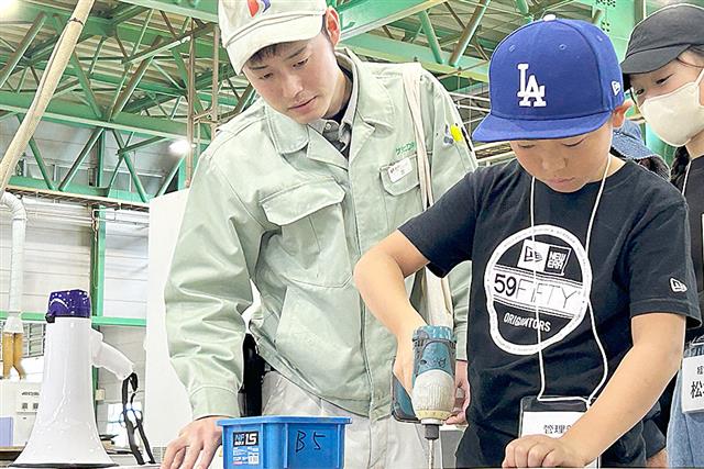 工場内でビス打ちを体験する従業員の家族(提供・サシヒロ)