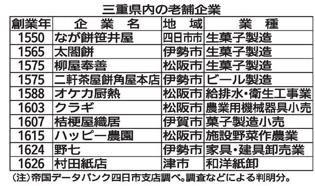 【四日市】帝国データバンク四日市支店は、三重県内で創業100年以上の老舗企業が889社に上るとの調査結果をまとめた。全体に占める老舗企業の割合は3・65%で、全国(2・75%)を上回った。