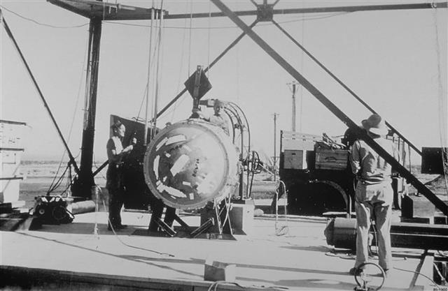 1945年7月、米ニューメキシコ州の「トリニティ・サイト」で実験用の鉄塔につるされる原爆「ガジェット」(ゲッティ=共同)