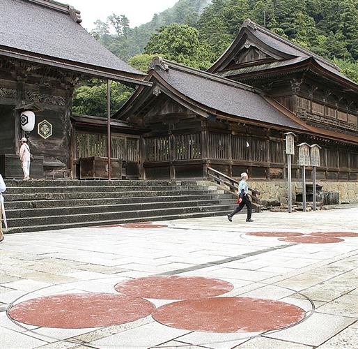 出雲大社の境内から出土した巨大な柱の場所を示す印=島根県出雲市