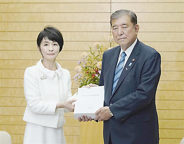 2023年度決算検査報告を田中弥生会計検査院長(左)から受け取る石破首相=6日午後、首相官邸