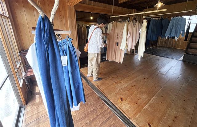 草木染めや藍染めの服が並ぶ「石徹白洋品店」=郡上市