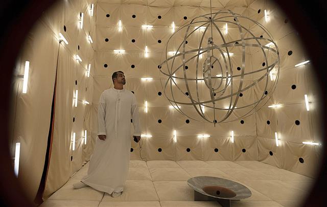 アラブ首長国連邦のドバイで開かれたデザインのイベントで、没入型の作品を楽しむ来場者。(AP=共同)...