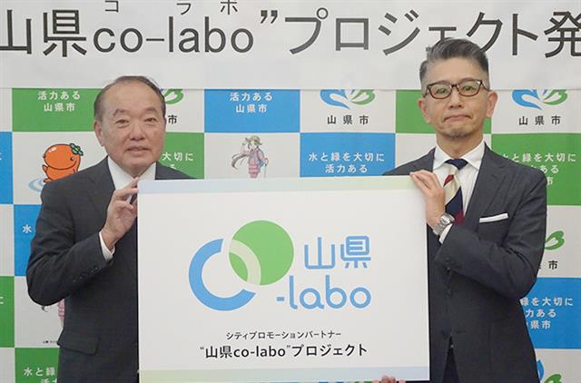 プロジェクト開始に伴い、山県市役所で記者会見を開いた(左から林市長、村多部長)
