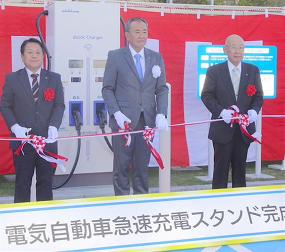 充電スタンド開設に伴い、テープカットを行った(左から空議長、石田市長、木村社長)