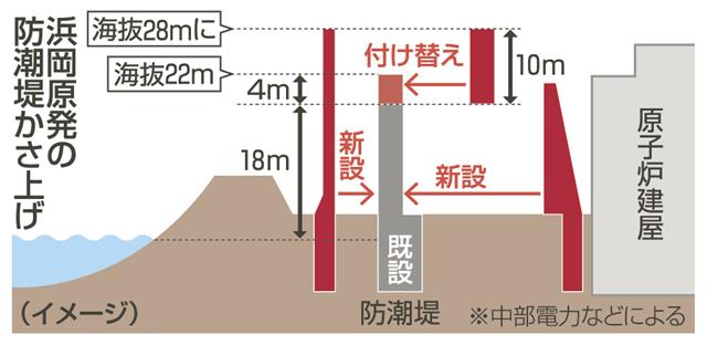 中部電力の林欣吾社長は13日、浜岡原発(静岡県)の防潮堤を海抜22メートルから28メートルにかさ上...