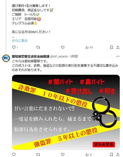 闇バイトの募集とみられる投稿に返信された愛知県警の警告文(県警生活安全総務課の公式Xから)