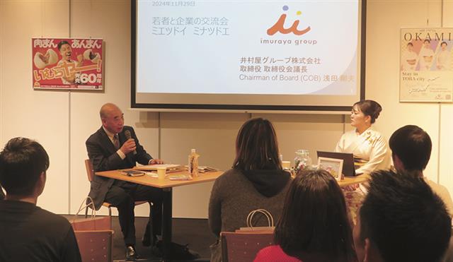 三重県産業支援センターは、東京・日本橋にある県の首都圏営業拠点「三重テラス」で、若者と企業経営者の交流会「ミエツドイ ミナツドエ」を開催した。井村屋グループ(本社津市)の浅田剛夫取締役・取締役会議長と鳥羽ビューホテル花真珠(本社鳥羽市)の迫間優子女将が対談した。