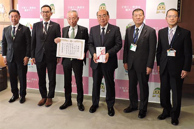 感謝状を持つ高間理事長(左から3人目)と目録を手にする加藤市長(同4人目)