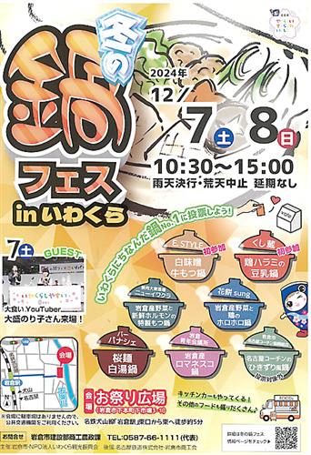 【尾張】岩倉市とNPO法人いわくら観光振興会は7、8の両日、同市下本町のお祭り広場で、「冬の鍋フェスinいわくら」を開催する。地元飲食店など7店が「いわくらにちなんだ鍋」を提供し、来場者投票でナンバーワンを決める。