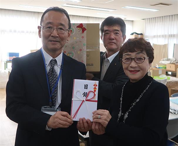 岡崎市の福祉施設にプロジェクターを贈る谷澤氏(右)