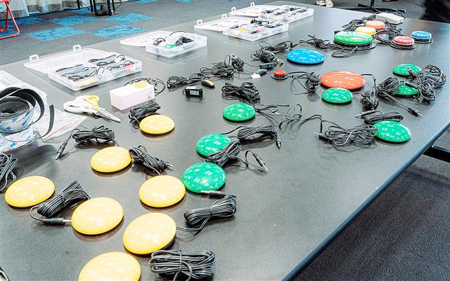 イベントで用意された入力補助装置の一部=8月、東京都品川区