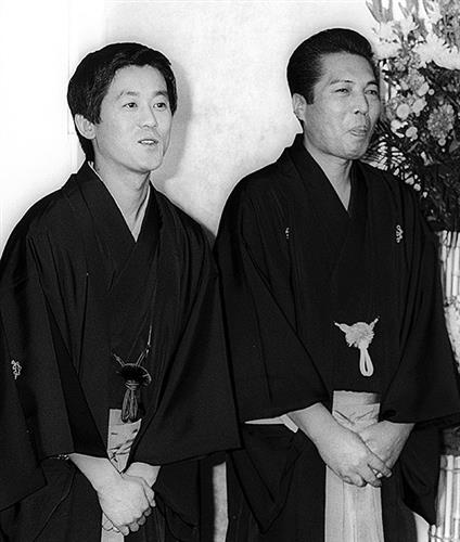 三遊亭楽太郎(後の六代目円楽、左)と五代目三遊亭円楽=1981年、東京都内のホテル