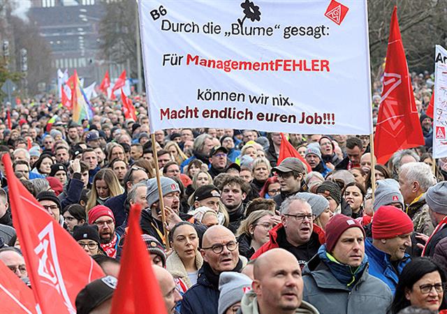 フォルクスワーゲン経営側に賃上げを求めて抗議する従業員ら=2日、ドイツ北部ウォルフスブルク(ロイター=共同)