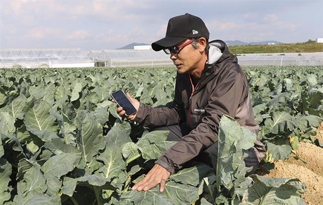 病害虫発生を予測するAIアプリを見る農家の朝倉さん=11月、豊橋市
