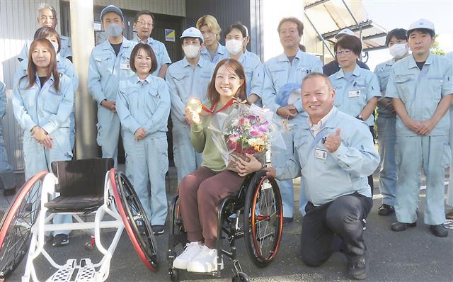 パリ・パラリンピック車いすテニス金メダリストの田中愛美選手(中央)と笑顔でポーズをとる橋本エンジニアリングの橋本裕司社長(手前右)ら=浜松市(同社提供)