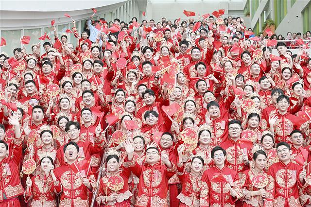 合同結婚式で記念撮影するカップル=9月、中国広東省東莞市(共同)