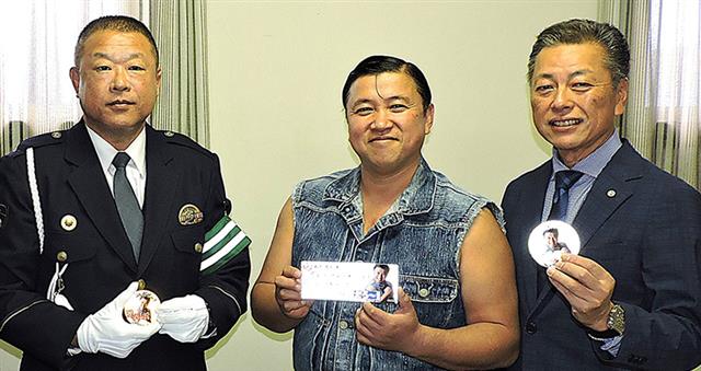 寄贈したステッカーを持つ(右から)池戸社長、スギちゃん、進藤尚寛稲沢警察署長