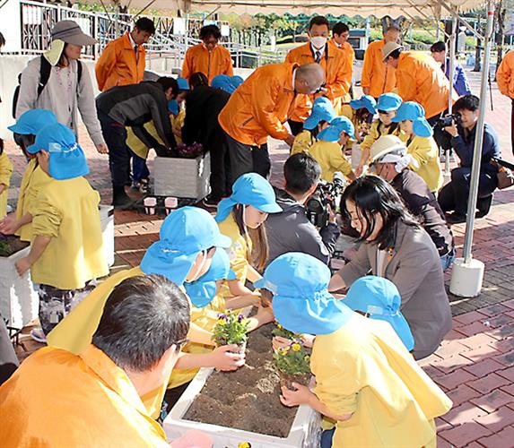 花苗を植えながら園児と交流を深めた
