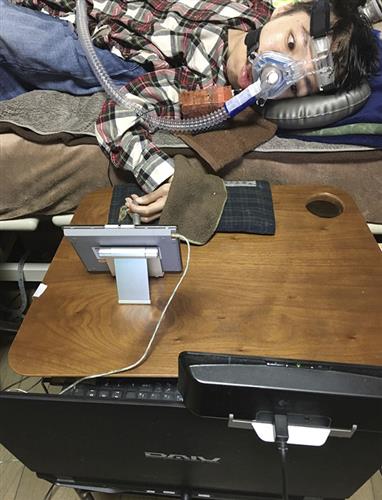 難病と闘いながら、タブレットを使いイラストを描き続けた山本さん=2018年10月、鳥取県若桜町