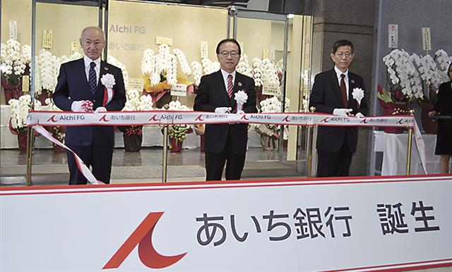 愛知銀行と中京銀行の合併により1日付で誕生した「あいち銀行」の記念式典が6日、名古屋市中区の同行本店(旧愛知銀行本店)で行われた。伊藤行記頭取らがテープカットを行い、新銀行の船出を祝った。
