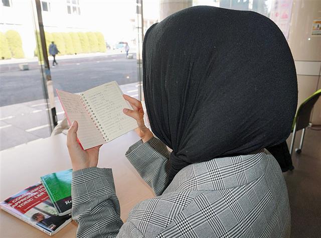 名古屋短大のキャンパスで英単語を書いたノートを開くハージャさん=豊明市