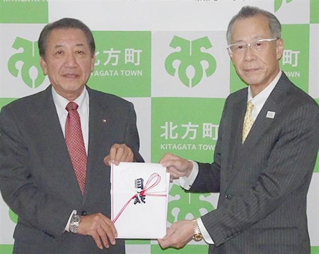 北方町役場で贈呈式を開いた(左から戸部町長、小川理事長)