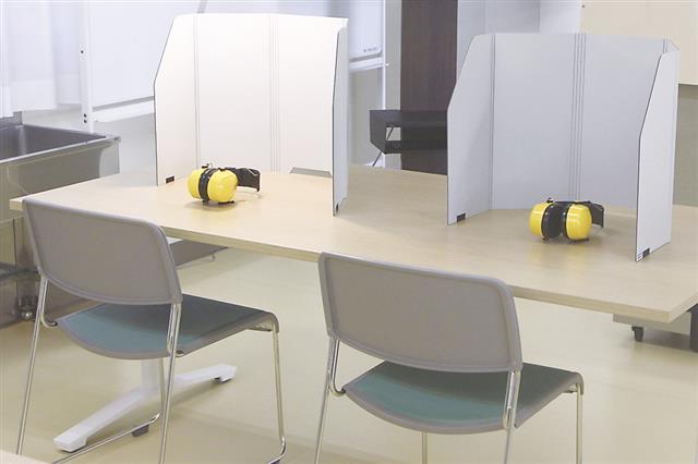 ついたてやヘッドホンを備えた作業スペース=堺市の大阪刑務所