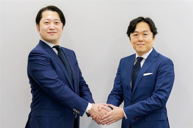 握手を交わすメルコHDの牧社長(左)とセキュアの谷口社長