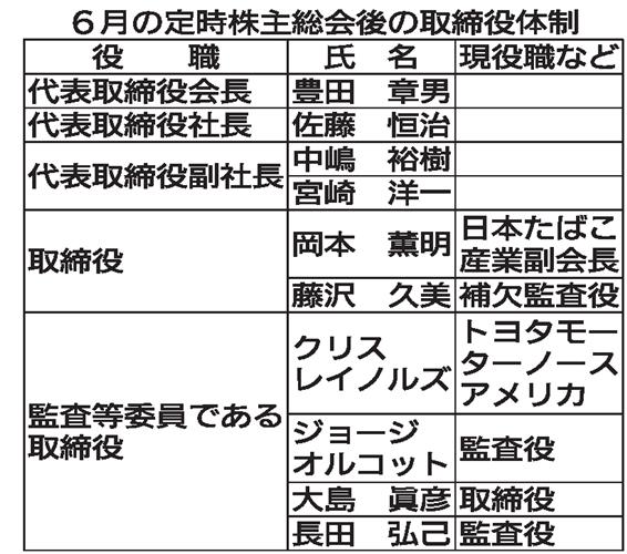 また、6月の定時株主総会日付で中嶋裕樹副社長(62)と宮崎洋一副社長(61)の2人が副社長のまま代表取締役に就くと発表した。一方で、代表権を持つ早川茂副会長(71)は退任する。代表取締役は豊田章男会長(68)と佐藤恒治社長(55)を合わせ4人となる。