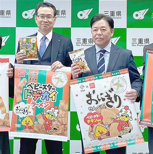 三重県を代表する菓子メーカー同士がコラボレーションした夢のお菓子が誕生―。「ベビースター」を手掛けるおやつカンパニー(本社津市、横山正志社長)と、「おにぎりせんべい」で知られるマスヤ(本社伊勢市、森紀之社長)は、互いの商品の味を入れ替えた期間限定商品を全国のコンビニエンスストアで発売した。
