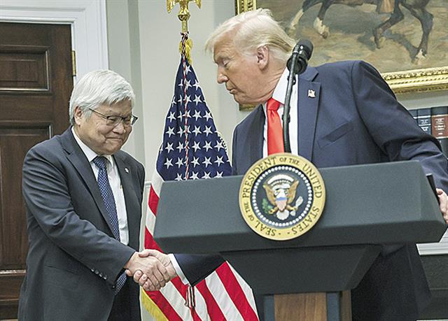 米ホワイトハウスでTSMCの魏哲家会長兼CEO(左)と握手するトランプ大統領=3日(AP=共同)