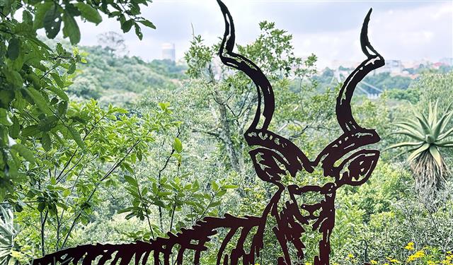 南アフリカ・ヨハネスブルクの公園に展示された草食動物のアート作品。草木と一体化しています。(AP=共...